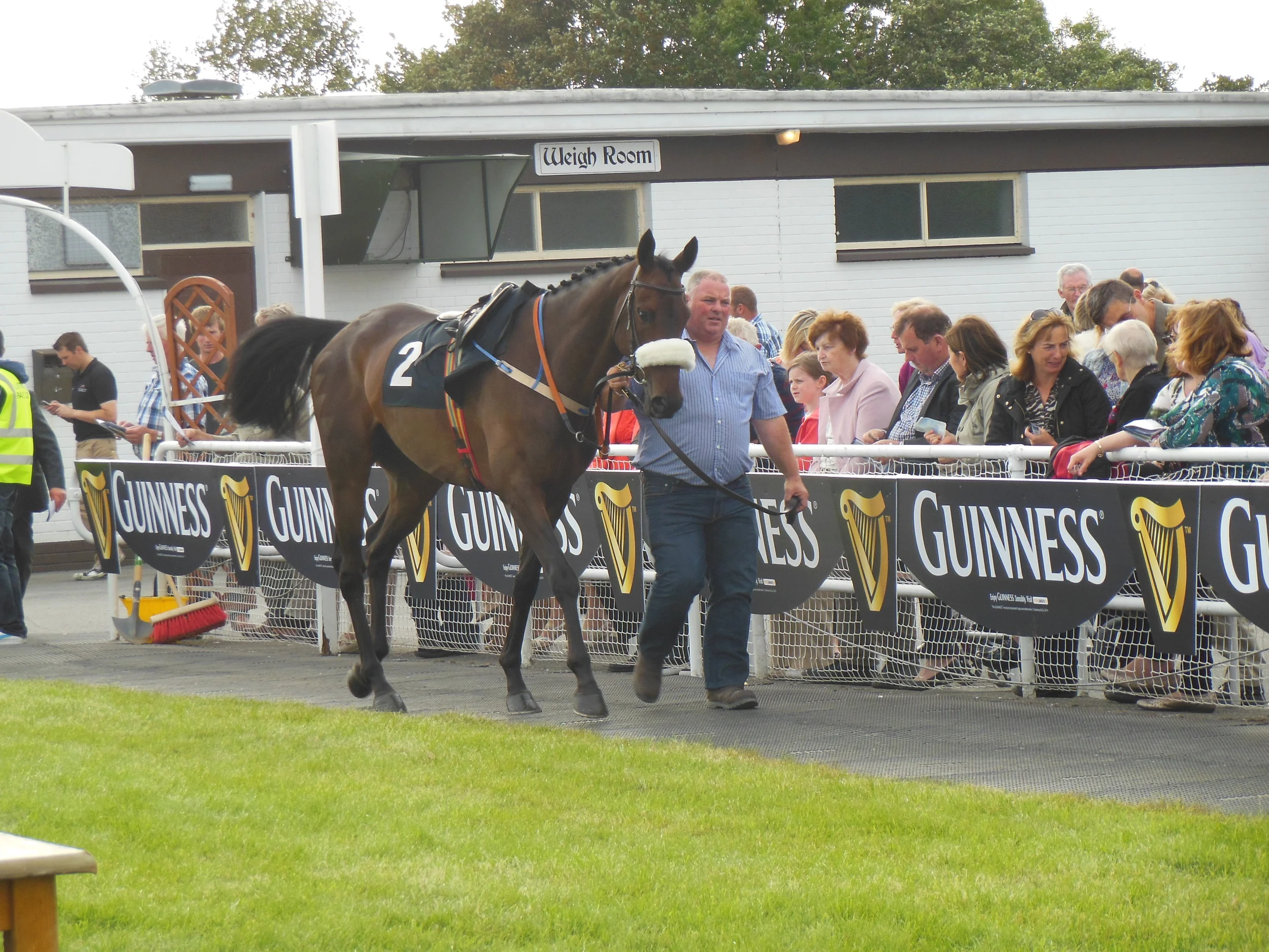 Of all the things I had worried about before the race from would he get balloted out to the state of the ground, from picking up an injury to getting the right jockey, the one thing that I had never considered was him taking a pee before the race. Apparently he was just preparing to relieve himself when he first got to the course but then the vet turned up to check the passport and inspect him and, being a shy horse, that put him off his stride, so to speak . So, now 3 hours later and only 75 minutes before the race, he still hadn’t managed it. I would never have imagined that I would be so concerned about the bathroom needs of a horse but here we all were just looking at him and hoping. Paul, who was leading him up, took him for a walk; presumably to get things going but that was not working. Peter then put him in the stable, closed the top and bottom doors and let him have some privacy. Privacy is, of course, a relative term as one of the funnier sights I have seen on a racecourse is Peter peering between the wooden slats to see if Bay of Freedom was doing the business. It’s not often you get a roar between races but that’s what happened when Peter gave us the ‘thumbs up’ – now there was no excuse.